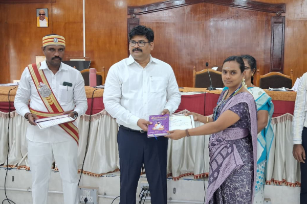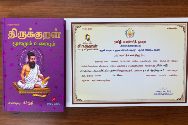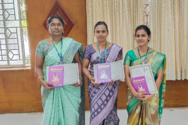 Tamil Teacher P. Suba, NTS- M. Ananthi & M. Swarna received an Appreciation certificate & Thirukkural book from Thiruvarur Collector – Thiru. V. Mohanachandran IAS for winning the Thirukkural Quiz competition organized by Tamil Development Department of TVR District.