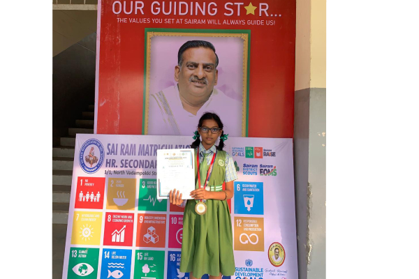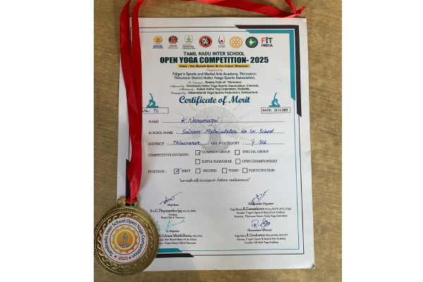 She participated in the Tamil Nadu Inter School Open Yoga Competition – 2025, held at New Bharath Matric Hr. Sec. School, Thiruvarur, and secured First Place in the Common Group category. Her dedication, discipline, and consistent practice have brought great honour to the school. This remarkable achievement reflects her commitment to physical fitness and yogic excellence.