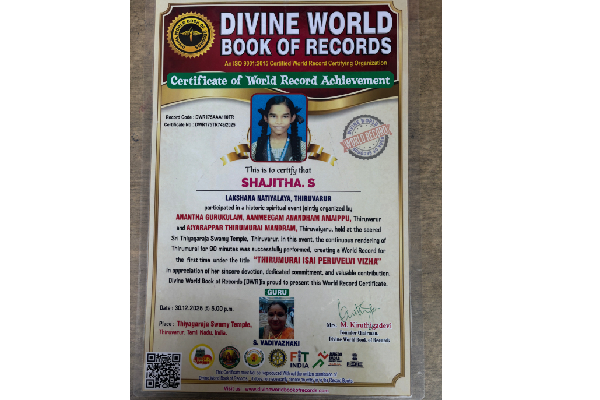 Shajitha S of 8A has been awarded a World Record Certificate by the Divine World Book of Records for achieving the “THIRUMURAI ISAI PERUVELVI VIZHA” by continuously rendering Lakshana Natialaya for 90 minutes at Sri Thiyagaraja Swamy Temple, Thiruvarur, in an event organized by Anantha Gurukulam and Aiyarappar Thrumurai Mandram. The ISO 9001:2015 certified organization recognized her sincere devotion and dedication with certificate No. DWR175TR749/2025.