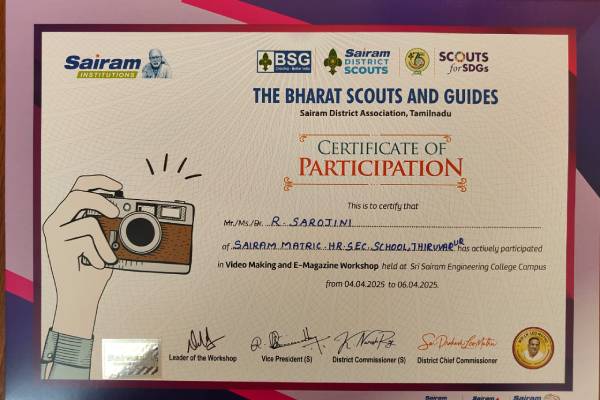 Miss. K.HASHINI of Sairam Matric Hr. Sec School Thiruvarur has actively Participated in Video Making and E-Magazine Workshop held at Sri Sairam Engg College Campus From 04/04/2025 to 06/04/2025